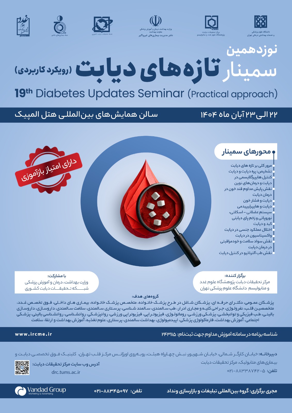 نوزدهمین سمینار تازه های دیابت (رویکرد کاربردی) زمان: 22-23 آبان ماه 1404 مکان: سالن همایش های بین المللی هتل المپیک
